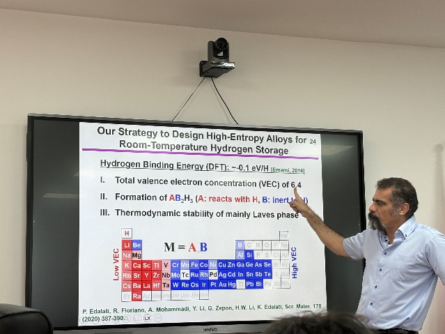 讲座中,Kaveh Edalati副教授首先介绍了高熵合金(High Entropy Alloys, HEAs)的基本概念和特性。他强调,高熵合金由于其独特的组成和微观结构,在储氢领域展现出巨大的应用潜力。随后,他详细阐述了高熵合金在储氢技术中的最新研究进展,特别是他在与高熵储氢合金相关的多个研究方向上取得的突破。