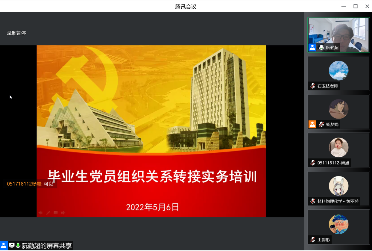 根据市委组织部、市教卫工作党委和公司党委关于做好2022年毕业生党员离校前教育和管理工作的相关通知要求,结合公司疫情防控工作实际,5月6日上午,材料工程公司党委在线开展毕业生党员离校教育,公司党委书记张朝民,校特邀党建组织员、校关工委委员、公司关工委常务副主任刘宇虹,公司党委副书记黄中子,公司党委组织员、党支部书记和毕业生党员出席会议。会议由黄中子副书记主持。