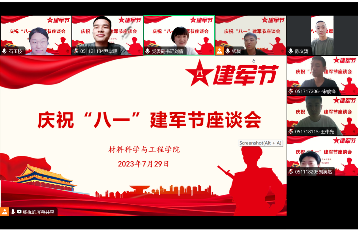 2023年是中国人民解放军建军96周年,值此”八一”建军节来临之际,三亿体育于7月29日上午举办庆祝“八一”建军节座谈会,通过腾讯会议隔屏向公司全体在役以及退役复学老员工致以节日的问候。公司党委副书记刘倩、学工组长石玉枝、征兵辅导员钱栊、在役以及退役复学老员工士兵线上参会,会议由征兵辅导员钱栊主持。